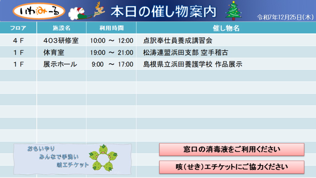 休館日  毎月第4土曜日及び12/29~翌年1/3まで
